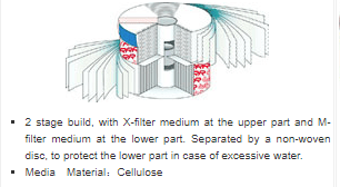 Importantly, the cellulose media allows water absorption of up to 200 millilitres within the filter, reducing the water concentration in oil to less than 100 parts per million.